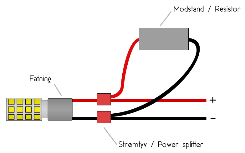 En snydemodstand skal tilsluttes parallelt med LED pæren, altså mellem plus og minus på fatningen. Det gøres nemt ved at benytte de strømtyve som medfølger. Ledningerne fra snydemodstanden klemmes sammen med ledningerne fra henholdsvis plus og minus fra fatningen.