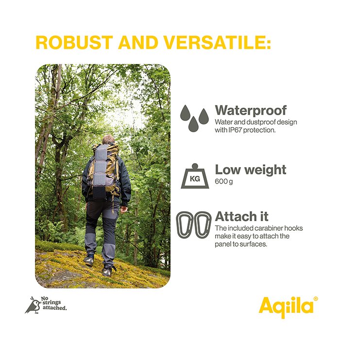 Aqiila Sunbird P21 er et must-have for enhver moderne campist. Sunbird P21 er foldbar og nem at tage med på dine eventyr. Når dine gadgets skal oplades, skal du blot finde solskin og folde panelet ud.